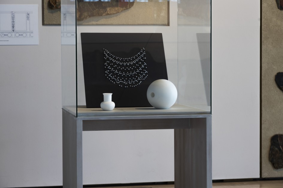 La résidence de recherche menée par Alix Boillot le long du fleuve Rhône, dans le prolongement de celle qu'elle a investie durant l'année 2024 à la Villa Médicis de Rome, lui a permis de choisir les lacrymatoires et les perles comme objets emblématiques, évocateurs de ses réflexions relatives à l'eau et au sel.